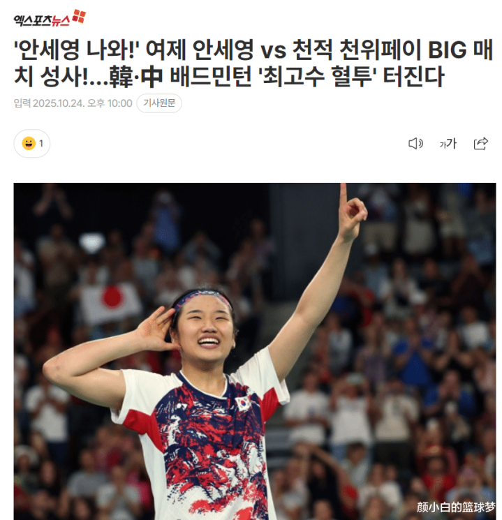 北京时间10月24日晚,韩媒《世博新闻》发文:安洗莹VS天敌陈雨菲,羽坛最巅峰对决再度袭来。安洗莹世界排名第一,陈雨菲世界排名第五。