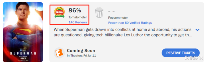 《超人》影评人口碑解禁,烂番茄新鲜度86%。