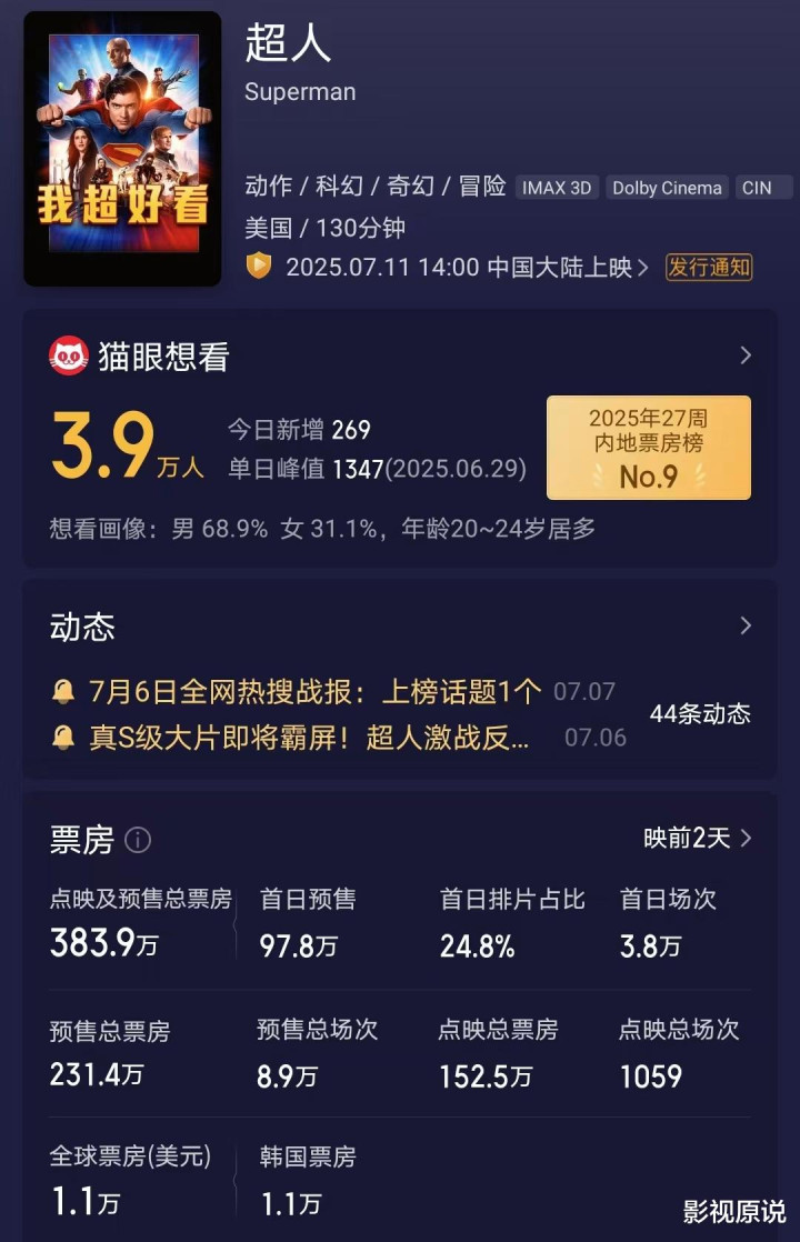 一开始的时候,《超人》就一直备受海外观众的关注和期待,它的海外热度值一度拉满,《侏罗纪世界4》《碟中谍8》和《星际宝贝史迪奇》等都远不能与之相比。